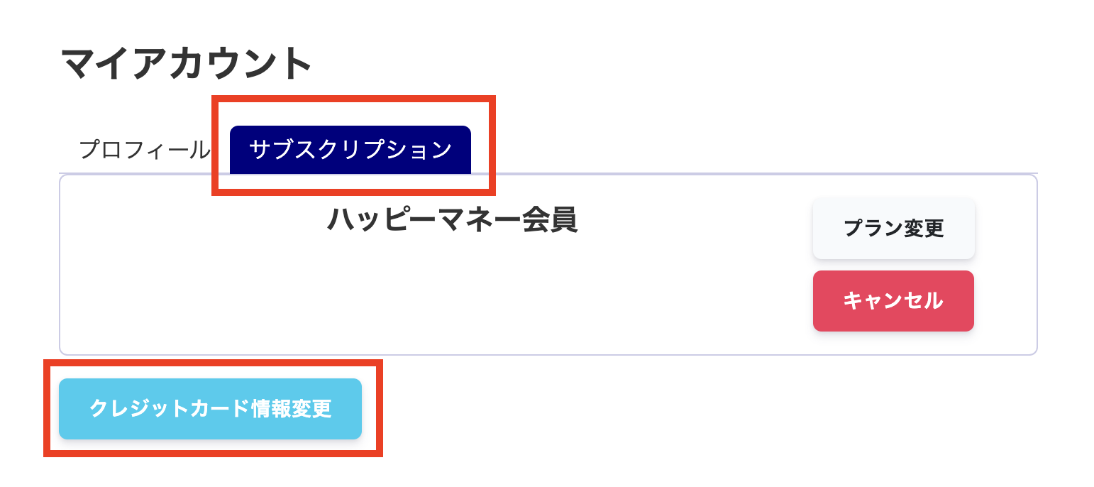 マイアカウント>サブスクリプション>クレジットカード情報変更 の順番にクリックしてください。新しいクレジットカード情報を入力して、「カードを保存」をクリックすると変更が完了します。